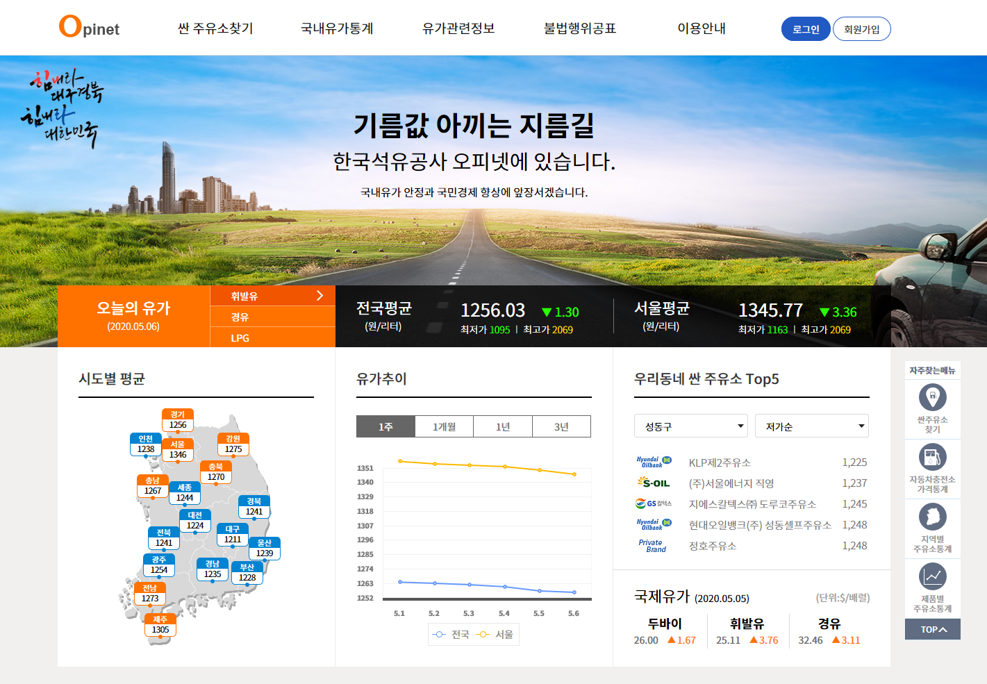 휘발유 기준으로 검색을 하면 최저가는 2020.05.06 기준 1095원.......